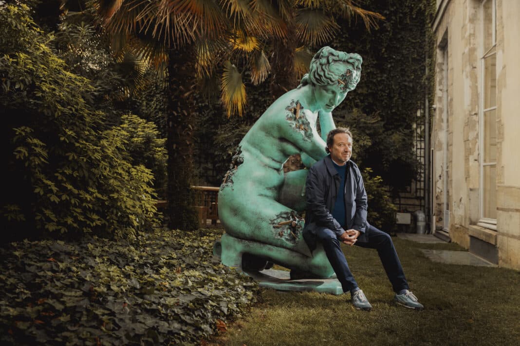 Nous voici attablés début septembre au Café des Musées, à un jet de pierres de sa galerie, rue de Turenne, autour d’un bœuf bourguignon peu indiqué par cette température caniculaire mais Emmanuel Perrotin confirme qu’il n’aime rien faire comme les autres et puis, m’assure-t-il, « c’est le meilleur de Paris ». Alors va pour le bœuf bourguignon. Cette histoire de présage « boettesque » résume bien le caractère à la fois volontaire et frais, déterminé et juvénile, d’un homme jamais repus de coïncidences extraordinaires et d’heureux hasards. Rencontrer Emmanuel Perrotin, cinquième plus important galeriste au monde d’après le dernier classement d’Art Review, demande l’endurance et le mental d’une bête d’ultra-trail. Arrivé à 10 h à son bureau, j’ai quitté à 16h30 ce super véloce volubile. Me tutoyant d’emblée, mais il est vrai que nous nous sommes croisés parfois, même la nuit : je me souviens du Prix de Flore de l’an dernier où nous avions partagé avec d’autres la festivité contagieuse de Frédéric Beigbeder, cependant que Yarol Poupaud allumait le feu avec sa SG Deluxe 1972. Si je cite le modèle de guitare, c’est que, parfois, pendant la conversation, Perrotin me lance : « t’en sais des choses, c’est incroyable !! » sans trop que je sache si c’est sincère ou ironique tant ces compliments émerveillés de l’autodidacte qu’il est (arrêt des études avant le Bac), semblent presque gênants, voire too much. Je parie sur la sincérité.