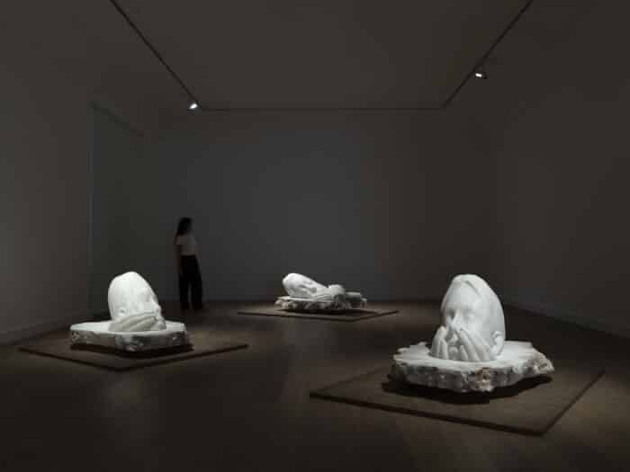 Qui sont ces anges aux visages si ressemblants ? « Des très jeunes modèles saisis à l’âge où tout bascule, l’enfance est encore perceptible mais déjà s’avance le frémissement d’une féminité adulte. Je suis fasciné par ce passage du temps sur les jeunes filles, il y a quelque chose de difficilement exprimable qui tient de la grâce, du miracle et du mystère quasi divin ». J’observe celles je devais retrouver plus tard chez Lelong : elles m’évoquent, que les modèles bien vivants me pardonnent, des reines mortes telles qu’on peut parfois les contempler dans quelques cathédrales, bien que celles-ci semblent plutôt être dans le « troisième état entre la vie et la mort », découvert depuis peu par des scientifiques. Mortes frémissantes, vivantes mortelles… J’observe de près ces têtes apaisées émergeant de corolles d’albâtre et ces mains jointes tour à tour implorantes, protectrices, caressantes. Je scrute ces cinq beautés, comme autant de songes réunis dans une mise en scène à la sobriété de crypte apaisante. Cinq Rêves, donc, puisque tel est le titre choisi par Plensa pour l’exposition du 13 rue de Téhéran. Les sculptures sont disposées au sol, à l’horizontale, évoquant par les subtils jeux de lumières des nénuphars ou des pierres flottantes émergeant d’un Léthé invisible. « Le chiffre 5 a toujours été paré chez moi d’une puissante aura. C’est en réalité le chiffre magique. Nous avons cinq doigts à chaque main, sans lesquels nous ne serions rien. Ce chiffre me revient sans cesse à l’esprit. À ces Cinq Rêves, j’ai ajouté Cinq Désirs au 38 avenue Matignon, où deux grands portraits en fonte de fer oxydé se font face. À l’étage, j’ai placé un visage en bronze peint de blanc que j’ai souhaité comme une présence quasiment éthérée ». Rêves, Désirs, deux mots déjà présents en 1997 dans l’intitulé de l’exposition au Jeu de Paume à Paris, deux mots traversant son œuvre à la manière, me précise-t-il, « de formes mentales, corporelles et spirituelles dans lesquelles la figure humaine et le silence s’unissent pour créer quelque chose qui va au-delà de la simple matérialité de la sculpture ». L’albâtre, poli ou laissé brut, joue sur les tensions de texture et de lumière et l’interaction avec le visiteur. « Je suis toujours étonné, lors de conversations avec des amis architectes, que la plupart d’entre eux ne sont pas intéressés par la relation entre leurs constructions et l’environnement de celles-ci. Trouver la position, l’orientation idéale de mes pièces au sein d’un lieu est une de mes obsessions. Je pense qu’il est primordial qu’autour de mes objets exposés, chacun puisse éprouver le lien mystérieux, quasi organique qui relie les pièces, l’espace et le visiteur happé entre minéralité et rêve, comme si la matière devenait le symbole d’un état d’être ».