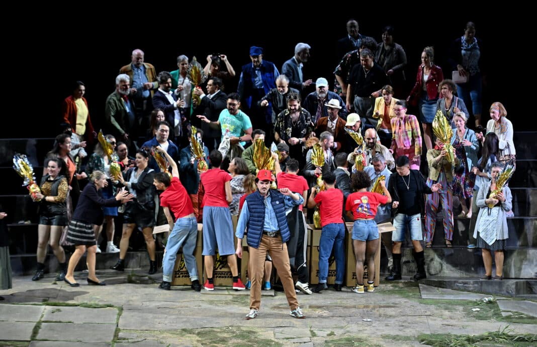 La scène figure un amphithéâtre de béton délabré et tagué, dans la banlieue d’une grande ville. En haut, côté cour, une immense croix de néon évoque une église derrière une clôture de fil de fer. Ce décor, transposant avec justesse la « vérité dramatique » de la fin du XIXe siècle à notre époque, s’avère particulièrement efficace dans Pagliacci, où l’amphithéâtre devient gradin de cirque. Le chœur des spectateurs y trouve toute sa place, entre agitation et ferveur, alors que dans Cavalleria rusticana, les choristes, figés, chantent avec douceur, « Les orangers embaument les verts talus alentour… » dans un cadre qui ne s’y prête guère… Le contraste entre le texte et la scénographie déroute parfois. Depuis les hauteurs du décor, les voix se perdent et résonnent mal, sans doute en raison de la configuration de la salle ; certains échos nuisent aussi à la clarté. Quand les rôles principaux — Turiddu et Canio, incarnés par Azer Zada — manquent de projection adéquate à ce type d’œuvres, l’effet dramatique s’en ressent. Or, la metteuse en scène Sylvia Paoli a eu l’idée d’ajouter un personnage muet : une vieille sans-abri, retrouvée morte au début de Pagliacci, créant un lien entre les deux opéras et une touche de réalisme contemporain.