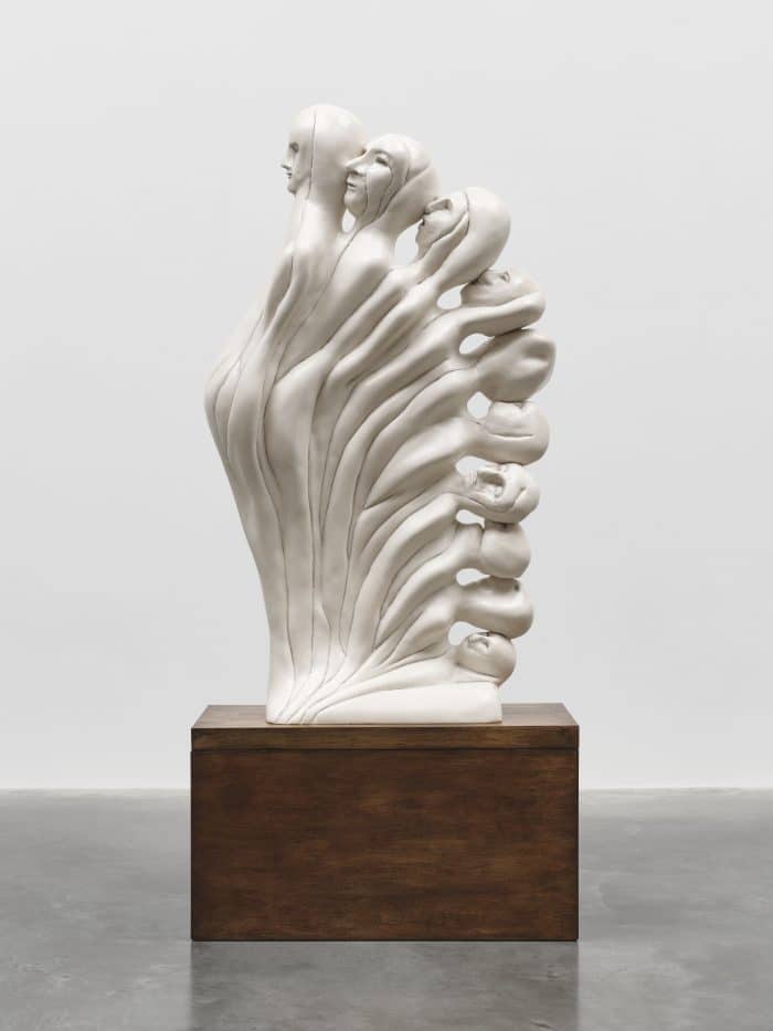 Assumption of we, 2014-25. Plâtre polymère, graphite, supports en acier inoxydable et socle en acier cuivré patiné bronze200 x 91 x 40 cm. © Enrico David. Photo © White Cube (Theo Christelis).