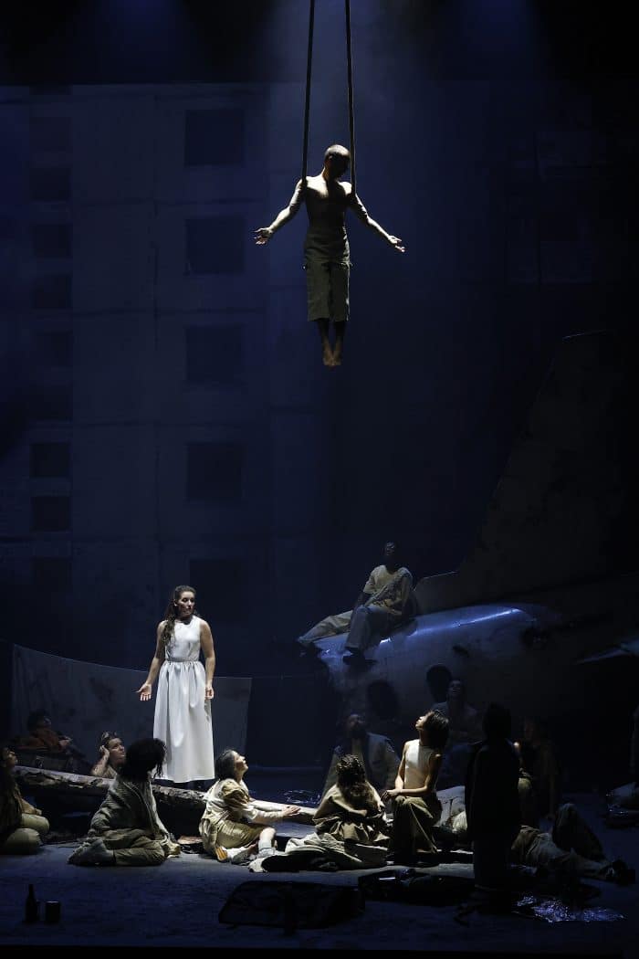 David Bobée en propose une vision apocalyptique : celle d’un crash d’avion. Devant les débris d’un appareil coupé en deux, les rescapés s’interrogent sur le sens de la vie et de la mort. Avant même que la musique ne commence et que la scène ne s’éclaire, la salle plongée dans le noir résonne de grondements sourds et inquiétants, évoquant la chute de l’avion. Les survivants apparaissent — le chœur incarne ici « une humanité collective », selon Bobée — et, durant une heure et demie, tentent de prolonger leurs vies en bivouaquant, en construisant des abris de fortune, en s’encourageant mutuellement. À la fin, ils déconstruisent la carcasse de l’avion, « métaphore des dérives humaines et d’un monde lancé à toute vitesse vers sa chute », comme pour effacer leurs traces… Ou renoncer à cette course effrénée et insensée ?