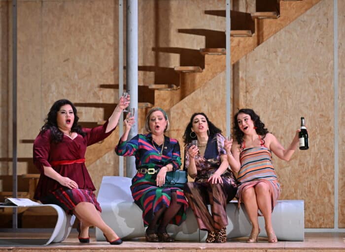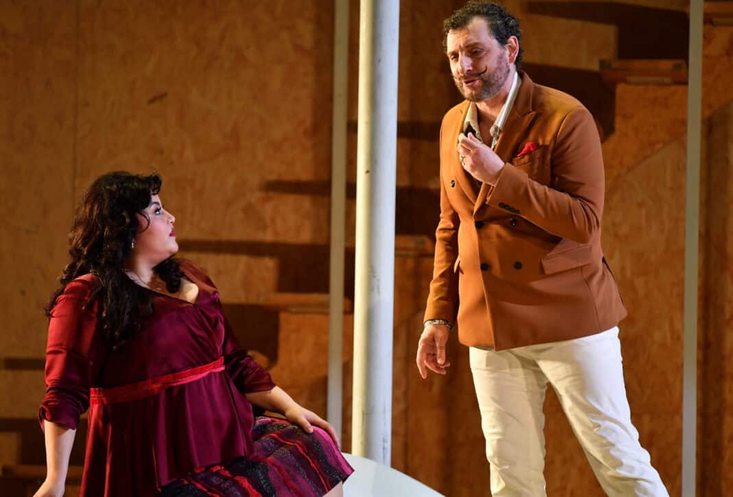Décidément, le monde de la mise en scène lyrique semble traversé par une grande tendance : celle de transposer les intrigues dans des environnements socio-culturels plus ou moins défavorisés. Après Robinson Crusoé dans une tente de SDF au pied de gratte-ciel américains puis Hänsel et Gretel dans une maison de fortune au cœur d’un bidonville, voici Falstaff installé devant un stand de kebab, au bas d’un immeuble HLM — une idée pourtant conçue dès 2020. Le chevalier imaginé par Verdi y prend les traits d’un pervers narcissique : l’énormité n’est plus celle du corps, mais celle de l’ego. Mince, soigneusement apprêté, ce Falstaff s’adresse à un patron de kebab qui remplace le tavernier et ses bouteilles de xérès par des canettes de boisson.