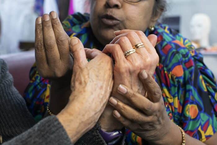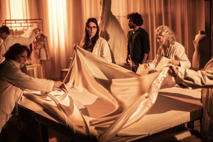 Au plateau, la robe sera omniprésente, mais ce qui m’intéressait de tisser, ce sont les histoires de ces femmes et de ces hommes chargés de la créer, que ce soit les designers, la cheffe d’ateliers, les petites mains, les dentellières et les brodeurs qui chacun à leur échelle vont permettre que cette tenue légendaire puisse exister dans les temps. Dans cette optique de mettre en avant une diversité de personnages de l’ombre, il était important que sur scène on puisse la ressentir. C’est pourquoi j’ai fait appel à des comédiens et des comédiennes de tous horizons. Certains sont professionnels d’autres amateurs, notamment parce que j’avais besoin par souci d’authenticité d’artistes parlant le tamoul ou sachant broder par exemple. Ce qui est troublant c’est que Raji qui est née en Inde, Anaele, une jeune fille de 18 ans, Nanii qui vient du rap ou Liliane, qui vient d’avoir 85 ans et n’était jamais montée sur les planches d’un théâtre, quelle que soit leur raison, leur parcours, aient un intérêt ou un lien avec la couture. C’est assez fou quand on y pense. Et cela va dans le sens du geste que je veux impulser avec ce spectacle. Le sujet, que je trouve passionnant pour ce qu’il représente, mais aussi pour l’artisanat insoupçonné qu’il renferme, crée du commun et a un côté très populaire.